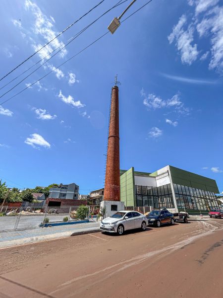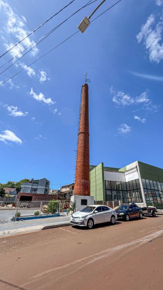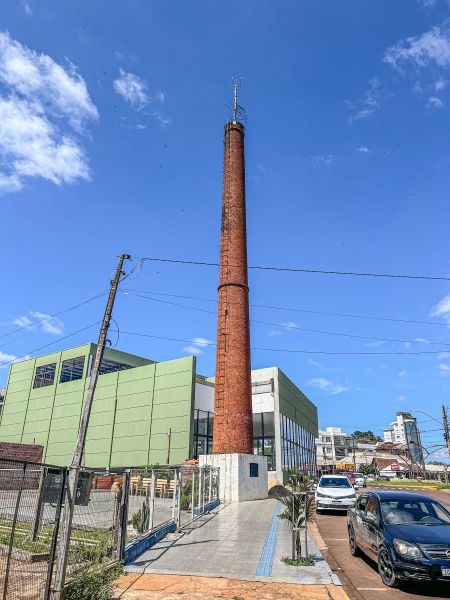 Imponente, a Chaminé com 26 metros de altura chama a atenção de quem chega ao centro da cidade de Três de Maio pela Avenida Senador Alberto Pasqualini. Ela é um marco da evolução do município.